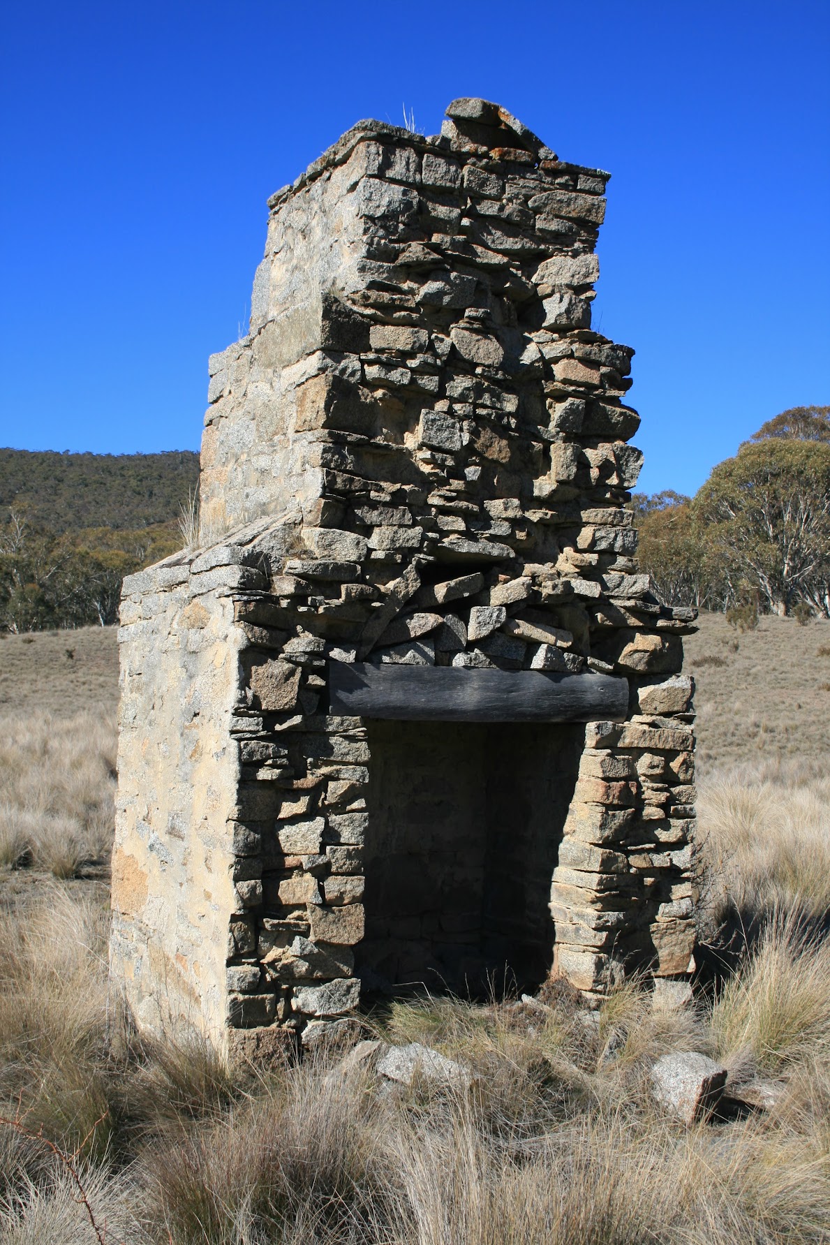 The Canberra Bushwalking Club has been kind enough to advertise this walk as a combined CBC/Parkway ramble, so we should get an interesting mix of walkers. No offence to anyone, but CBC walkers should be prepared to enjoy this walk as a ramble with plenty of time to smell the roses. Parkway folk - a great opportunity to talk with experts about bushwalking. Meet by 8am in the Parkway car park, cnr Sulwood Drive and the Tuggeranong Parkway. We'll car pool from there. Parkway folk - note that we pay the driver. Rug up - it will be cold. Bring morning tea and lunch. What will we see? 1 W-G BR13, SoS G42 - Potters Chimney; 2 SoS G43 - Grassy Creek Tussock Grasslands; 3 W-G BR17 - Reg Brayshaw's hut site; 4 W-G BR3 - Stockyards site; 5 W-G BR1 - Sam Aboud's hut site; 6 Sam Aboud's Dunny; 7 W-G BR2 Sam Aboud's Stock Pen; 8 W-G BR16 1-3, SoS G47 Chalker's Chimney; 9 W-G BR16 2-3 Hut site; 10 W-G BR16 3-3 Stockyard; 11 W-G BR8 John Brayshaw's 2 hut sites; 12 W-G BR4 Mt Clear tank; 13 W-G BR5 Mt Clear homestead complex. Timing estimates 8am leave – 1.5hrs drive – 5-6hrs walk – 1.5hrs drive, so back around 4-5pm. That is rubbery, but it does depend on many factors, like how good we are at finding the historic sites, how many roses we want to smell. Walk Not a good start as we drove past the sign at Tharwa saying Boboyen Road Closed. I decided that Hospital Creek Hut would be a reasonable alternative and that we'd continue to drive south. No mobile reception to ring the Namadgi Visitors Centre to enquire. But glimmers of hope as we passed a north-bound Government ute and another dirty car. The next road sign said Boboyen Road Open, so back to plan A. We stopped at the Hospital Hill lookout for the excellent view W into the Bimberi Wilderness and its snow covered peaks. Great signage here. A perfect, crisp blue-sky day. We were an eclectic group, with a range of backgrounds, interests and experience with bushwalking - the perfect mix for an enjoyable ramble. Heading from the car park, the conversations started immediately and we soon veered right off the fire trail along a vehicle track on the W side of Back or Grassy Creek to Potters Chimney (see pic 1). Being well equipped with background material this time, we poked around the creek bank and found the site of the source of the slate used to construct the chimney. Across the broad, swampy, dry creek bed and onto the Long Flat fire trail, following it to the right angled bend where it begins to climb away from the creek and its T-intersection with the Burnt Hill fire trail (the Burnt Hill ft is not marked on either the 1st or 2nd edition 1:25000 Bredbo maps). Near here we had a location for a hut site, but could not find it at the given location nor match anything against the profiles in the 30 year old photo. However, I had an alternative location, so we wandered along between the creek lines and found the granite stones of the chimney of Reg Brayshaw's hut (see pic 2). The photo now matched perfectly, the fire trail in it being the Burnt Hill ft, not Long Flat ft. Stretching up the gentle slope above the hut site, one could possibly imagine a lone quartz chip might indicate the knapping site (see pic 3). We had walked across and near much of the Grassy Creek tussock grasslands. Swinging N onto the Burnt Hill ft, we tromped back to rejoin the Long Flat ft and wiggled up the hill. Another abortive search for a stockyard site at a given location near the ft, so morning tea was enjoyed. Later, just near SH1247, the Stockyard appeared (see pic 4). A bag for sure, as it matched the 30 year old photo. A fair way away from the background material stated location. Funny, I've walked past here at least twice before and can't remember noticing the yards. On to Sam Aboud's dunny (see pic 6), which amused party members just as much it did me when I first saw it. Mike told the correct story of its construction. Whether it was better armed with background material, or sense to realise that a dunny would be near (but not too near) a hut site, or (as was this case) having an excellent spotter like Mike in the party, Sam Aboud's hut site turned up where it should have been (see pic 5). On a roll, we wandered down into the nearby tussocky creek bed and found Sam Aboud's Stock pen in quite good order (see pic 7). From here we walked back to pick up our gear, down the fire trail to the ford, then NE down the creek line to Chalkers Chimney (see pic 8). A great sight as we approached - blue sky, open tussocky grasslands with timber running up to Mt Clear and the large boulders near the chimney beckoning us for lunch. But first an explore - the stone footpath identified in the grass leading to the adjacent Hut site (see pic 9) and, a little way up the slope, the Stockyard site (see pic 10). A leisurely lunch on the warm boulders. Away again, this time through the open timber to the NW. Not a good line navigated by the leader (at least one living legend in the party picked this up, didn't you Janet), slipping off the side of a spur and hitting the Naas Valley fire trail to the west!! of the 2 fords. With the next site to the E along the fire trail, a couple of unplanned crossings of the Naas Creek. Someone has placed a convenient piece of timber near the E ford, so we were across dry footed. Visited John Brayshaw's two Hut sites (see pic 11 and pic 12). These are also known as Barrett's Hut sites. About turn and back over the fords. At the second we enjoyed sticks of thick ice from a puddle near the ford. It was 2.30pm and the sun was shining, but a cool day at the shaded pool. So back to the Mt Clear homestead area (see pic 13), passing by the Mt Clear tank. Great facilities now, even a modern loo (to make it a two dunny day). A little disappointing in that nothing is left of the original homestead complex - it must have been difficult for the last lessees to move out. But I understand that the original policy was to remove modern structures when the National Park 